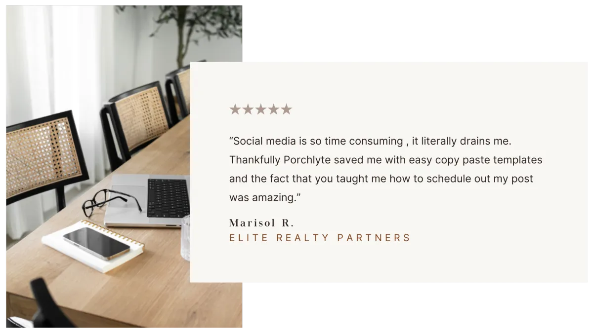With 30+ years in real estate (and still actively selling), I get how overwhelming this business can be. Juggling clients, showings, content creation, and trying to squeeze in a life somewhere between. That’s exactly why I created PorchLyte, to give agents like you the tools, templates, and support to show up consistently online without burning out.